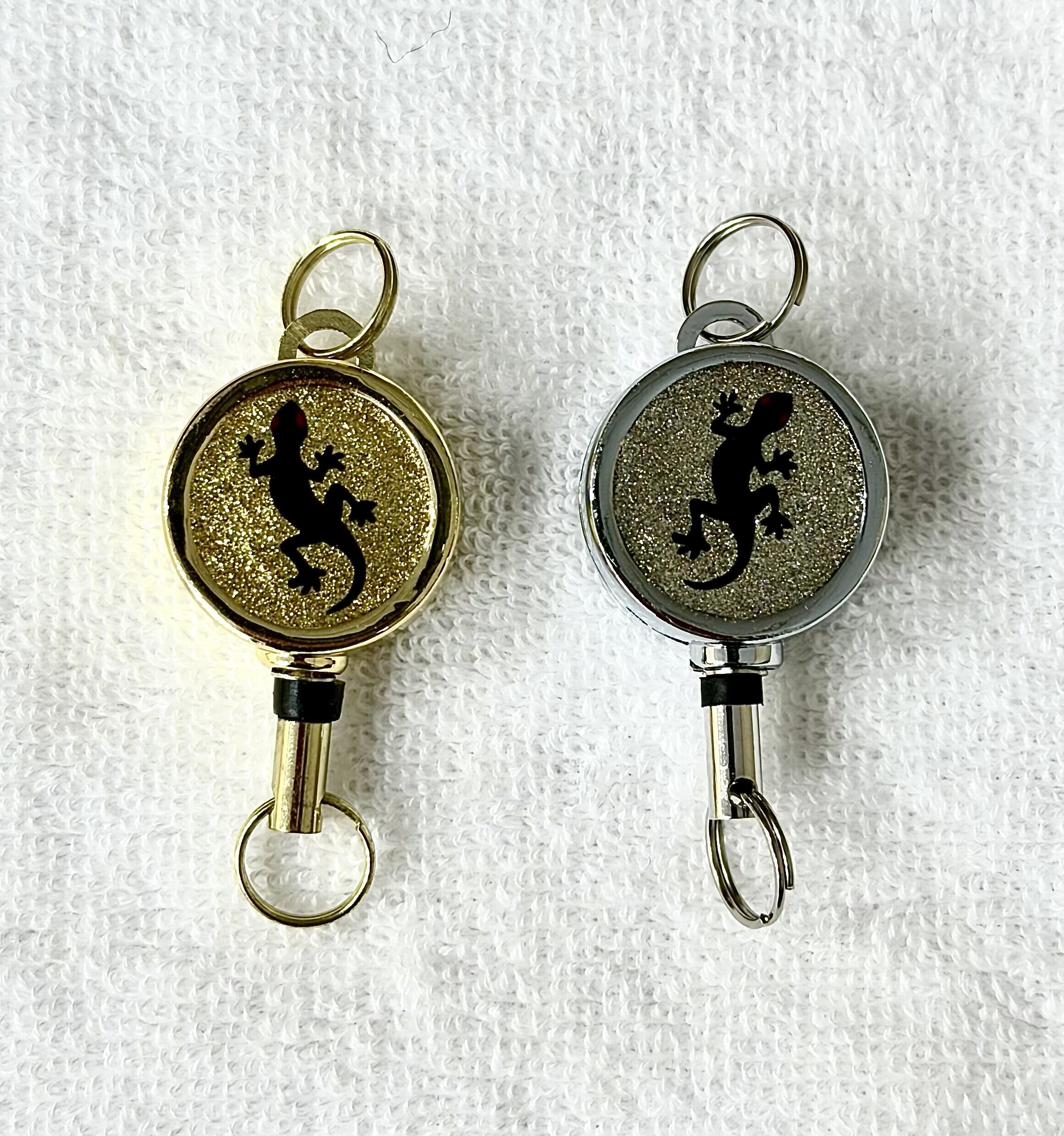 伸縮リールはオリジナルヤモリのロゴ入り。シルバーとゴールドがあり、通常は当方にてどちらかをお付けします。ご希望のある方は、備考欄、メッセージ欄にてご連絡ください。
