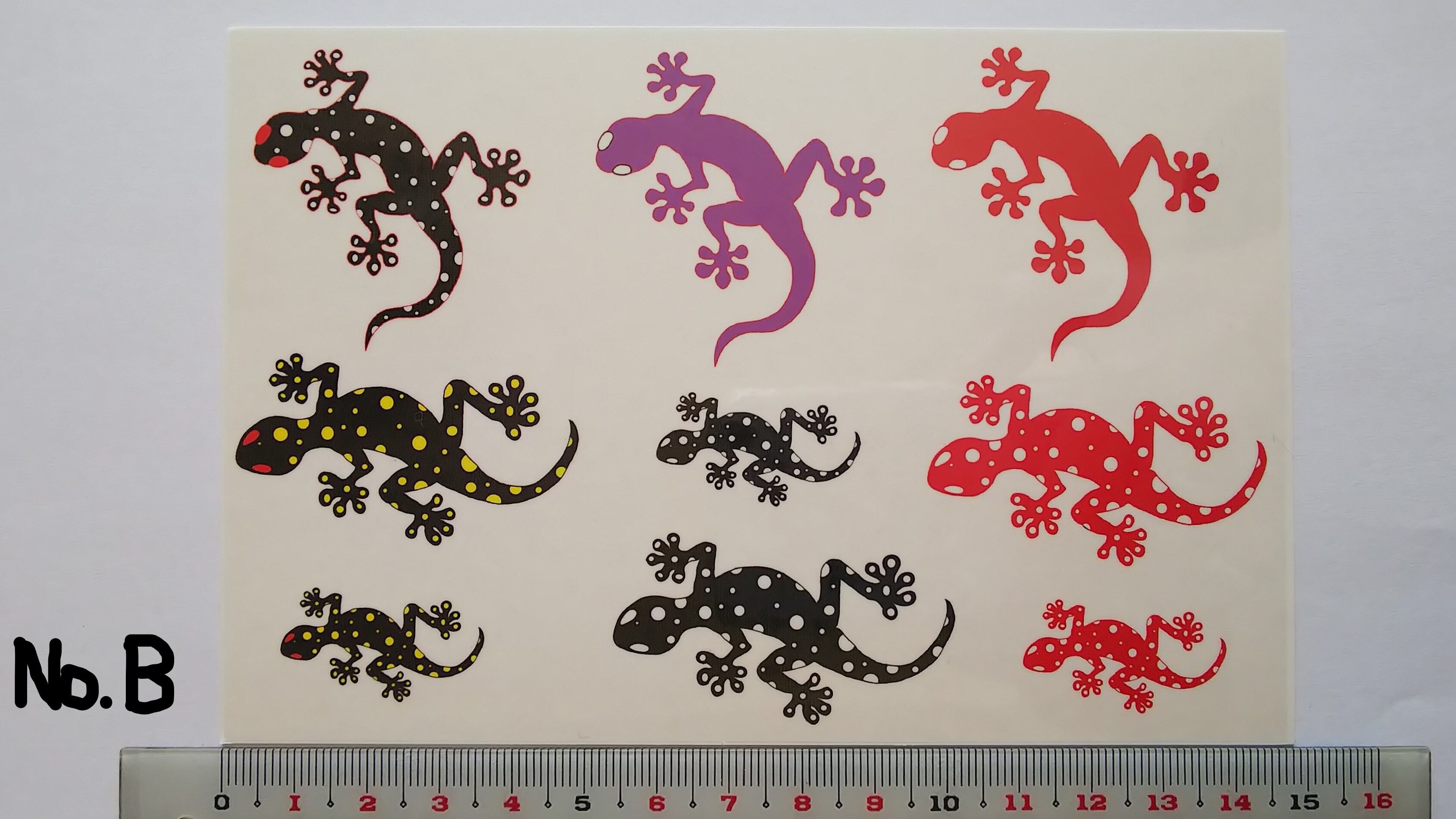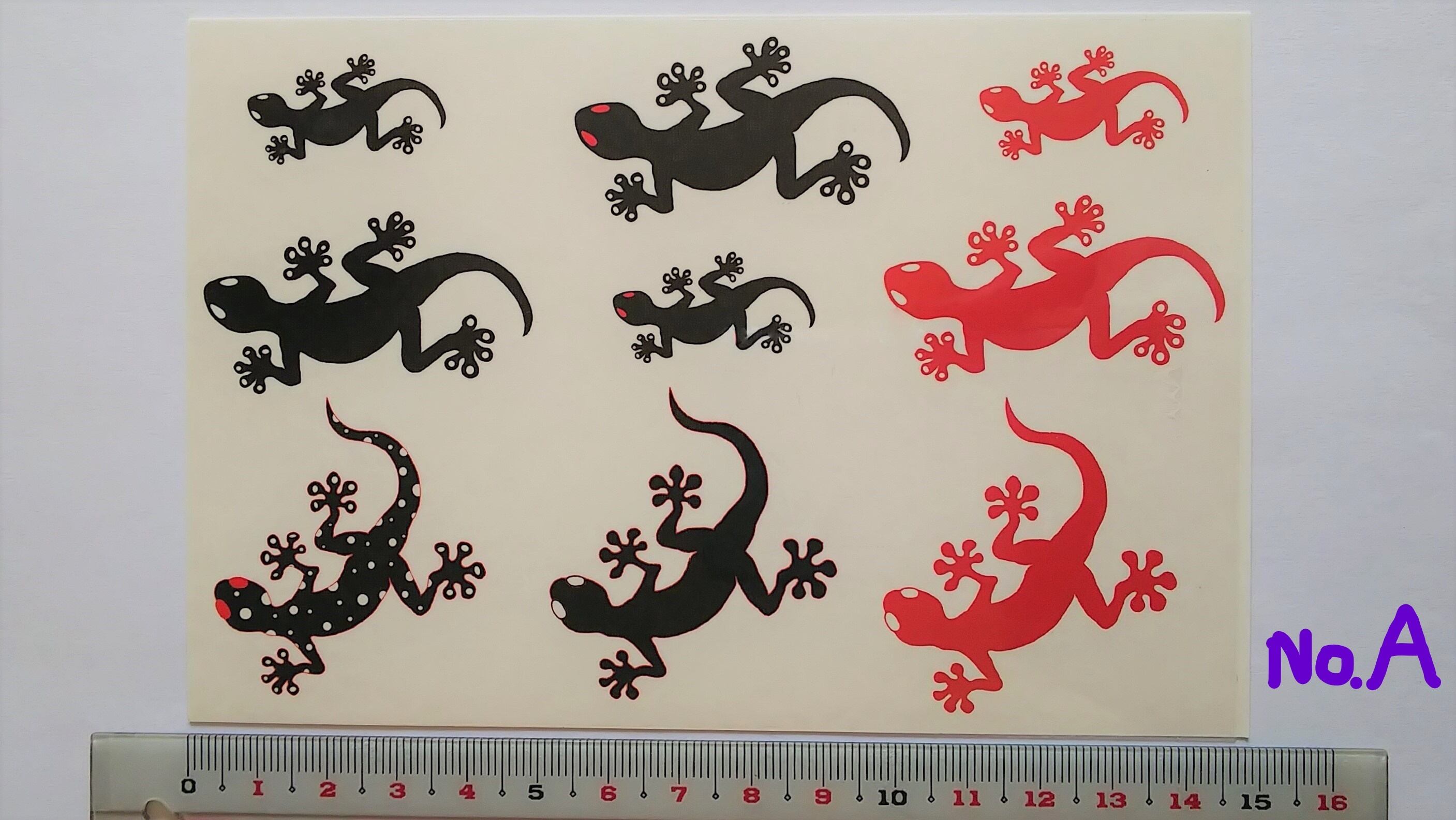 大きいヤモリは約4㎝、小さいヤモリは約2㎝ですので、腕や足、首のほか胸元のワンポイントに最適です。ご利用の際は、絵柄に沿って切り抜いてください。