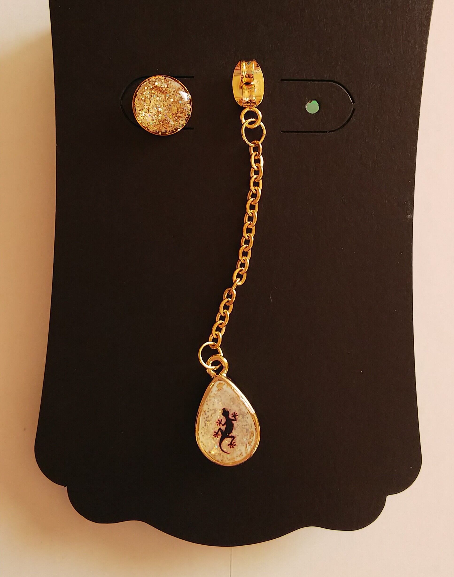 ③スタッドのチャームはブルーグリーン、キャッチのチャームはパールホワイトの背景色に黒ヤモリを、裏はレッドゴールド(サンセットビーチ)色で、珍しい色の作品。