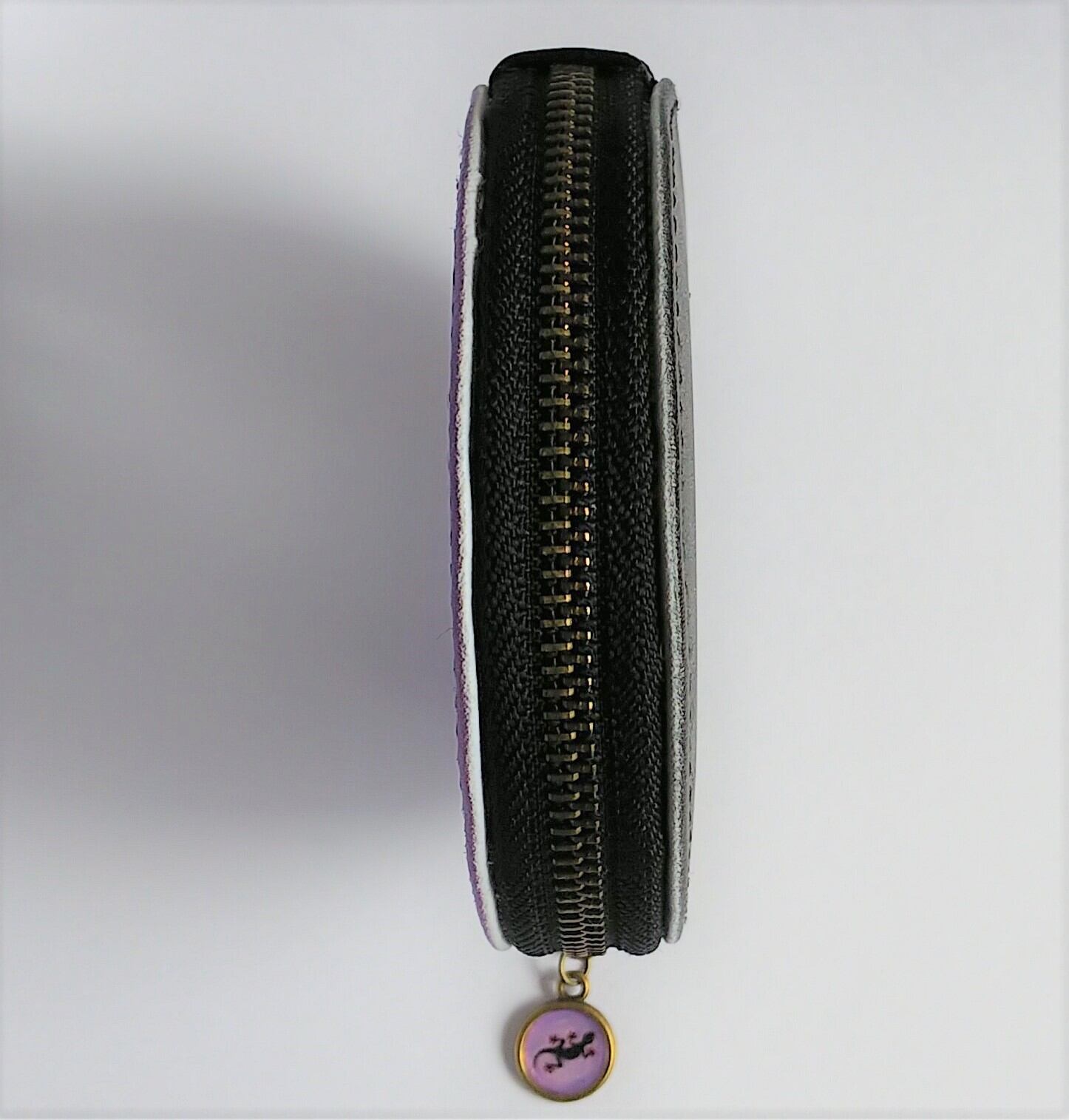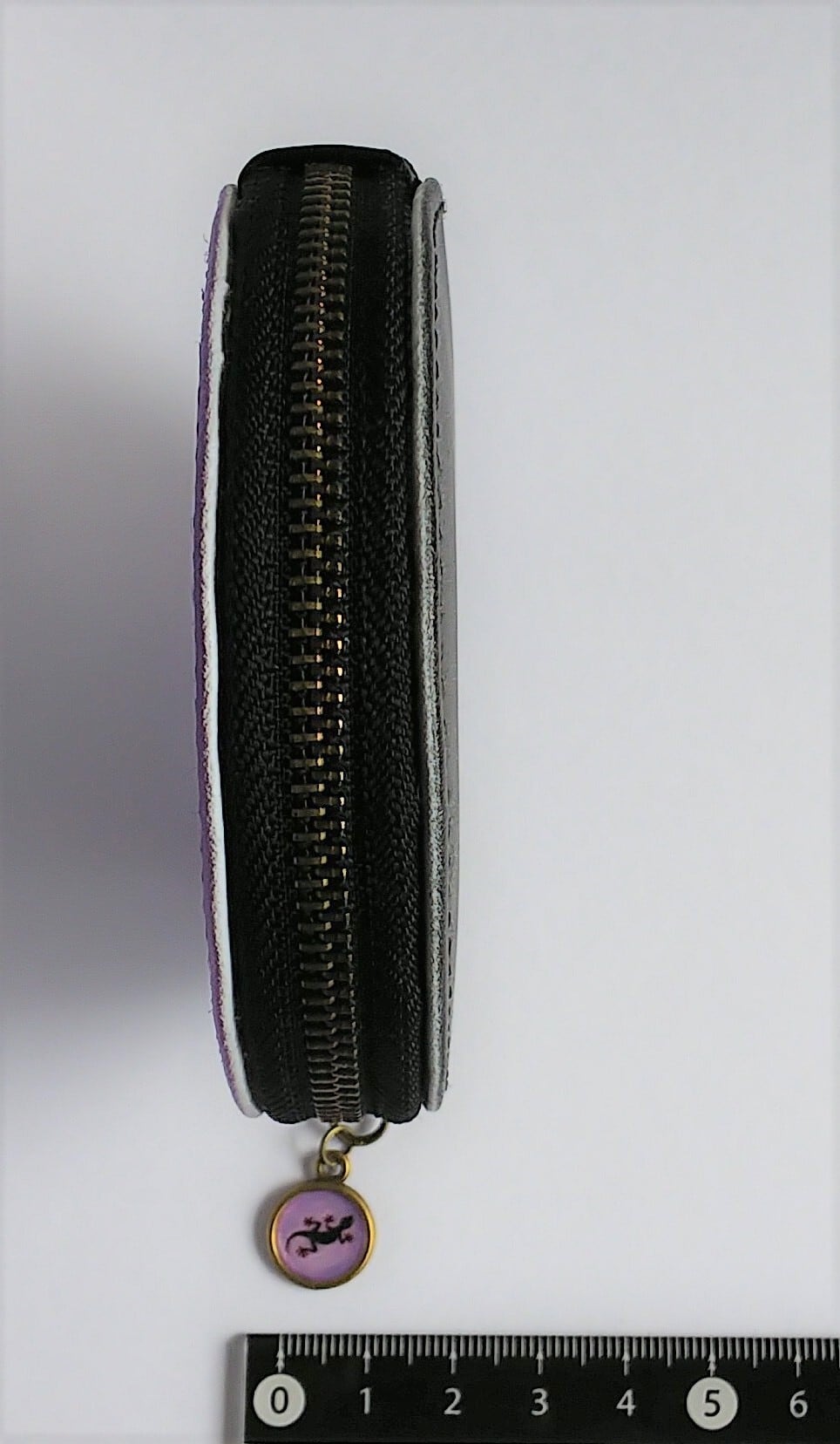さらに、ファスナーに合わせてアンティークゴールドのミニチャームを付けました。「銀座デコ」の得意のラベンダー色を背景色に黒ヤモリのデザインです。風水でも尊ばれる紫色を背景色として、コインケースにぴったりのデザインです。素材はポリウレタン(PU)で手触りの良い商品です。