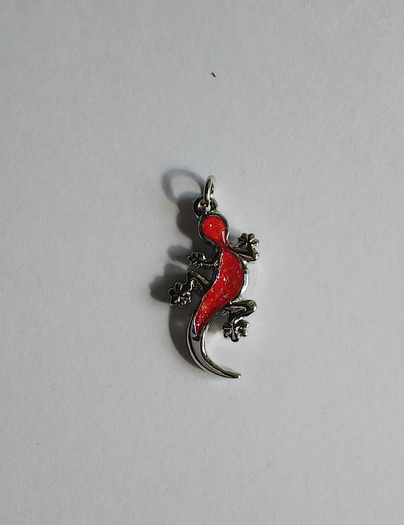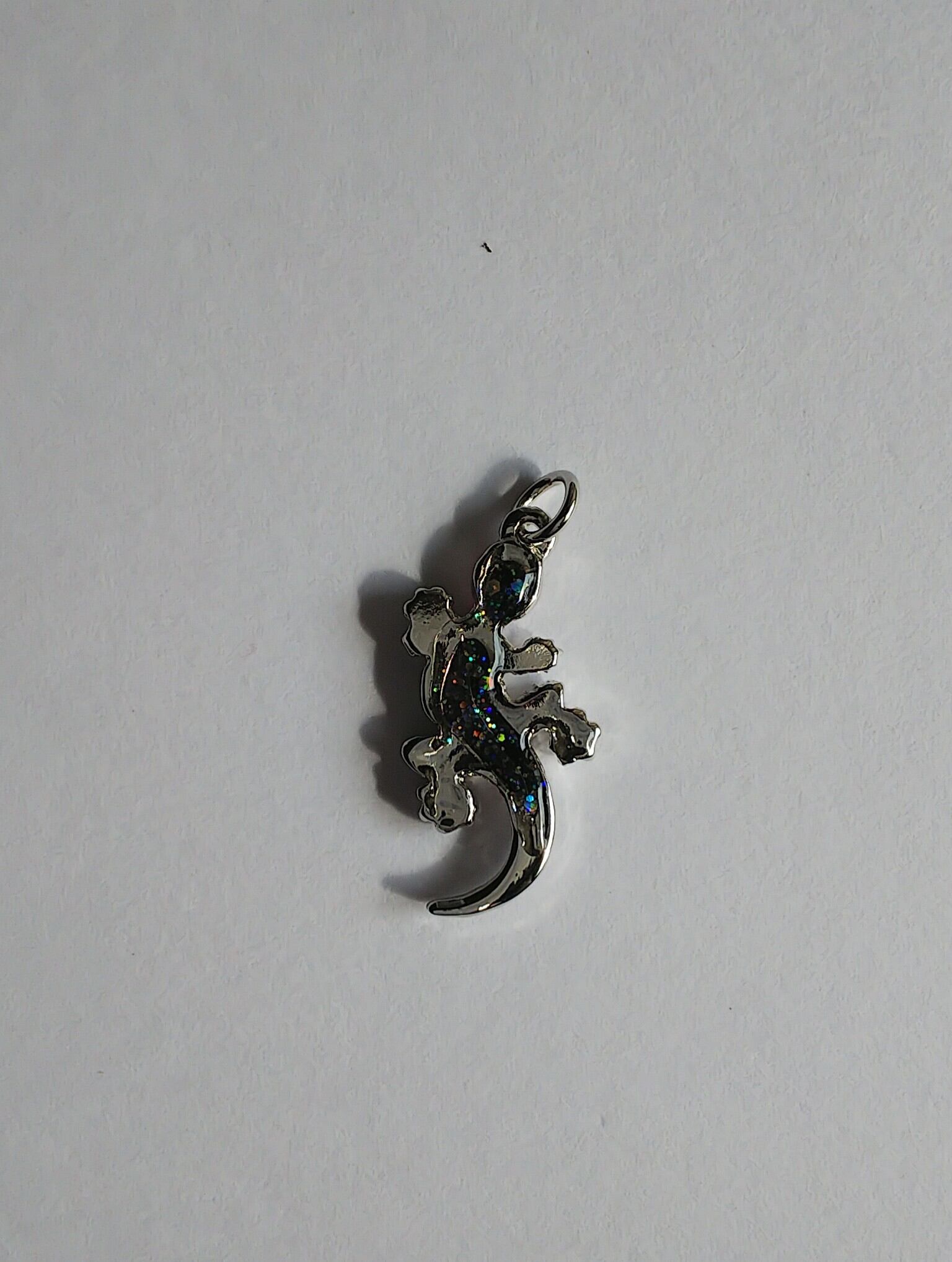 フレームは、大き過ぎず小さ過ぎないように、またシンプルながらヤモリの特徴を醸し出せるようにデザインしました。縦3㎝x横1㎝x厚み0.3㎝。素材は亜鉛に、金属アレルギーが出にくいニッケルフリーのメッキ処理を行っています。